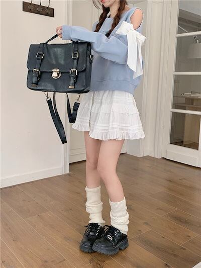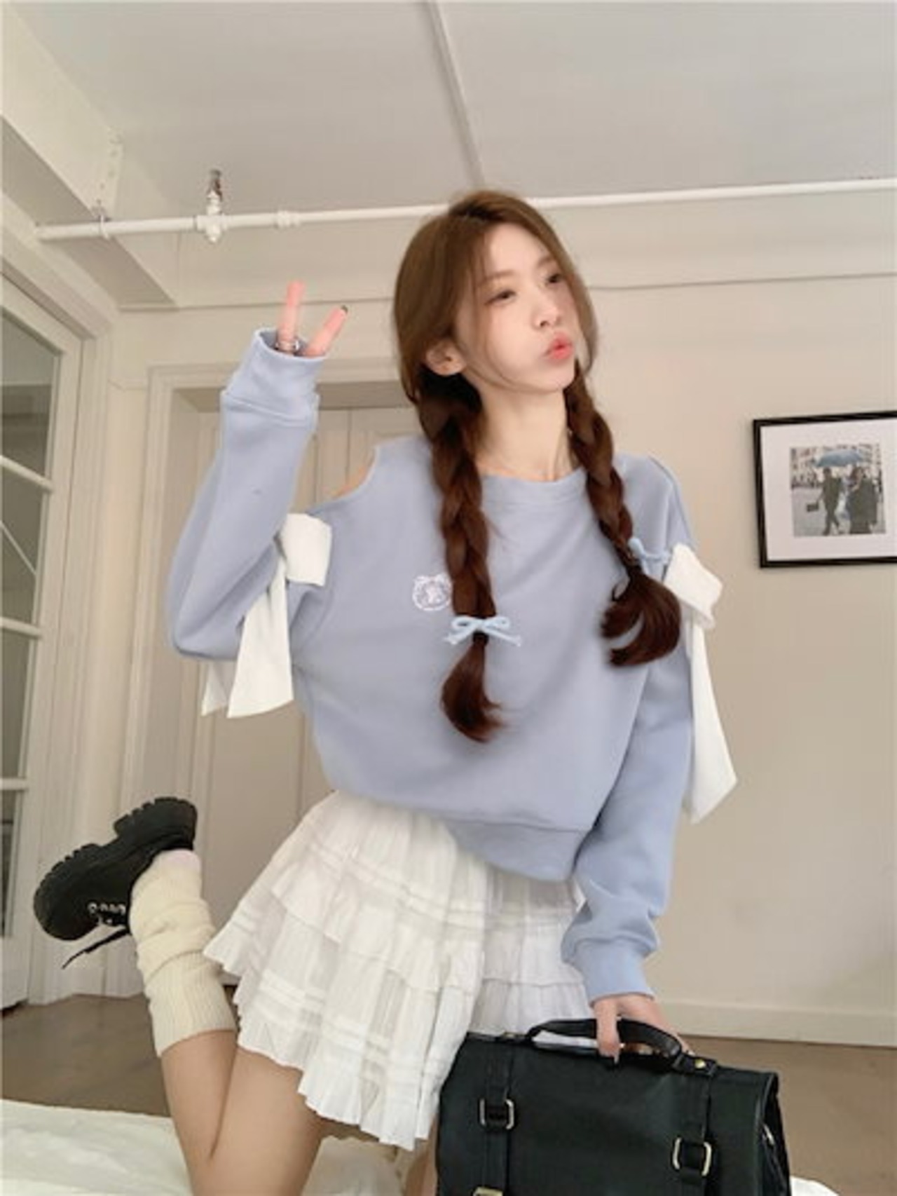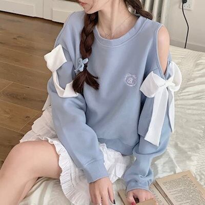 2024秋冬トップス ラウンドネック 長袖 ゆったり 秋 水色 青 ブルー おしゃれ かわいい ラブリー キュート 韓国ファッション オフ レディース お出かけ