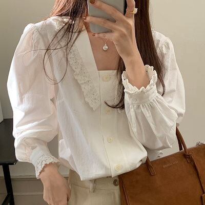 2024秋冬トップス シャツ 長袖 レース スクエアネック ゆったり 秋 白 ホワイト おしゃれ かわいい 韓国ファッション レディース お出かけ