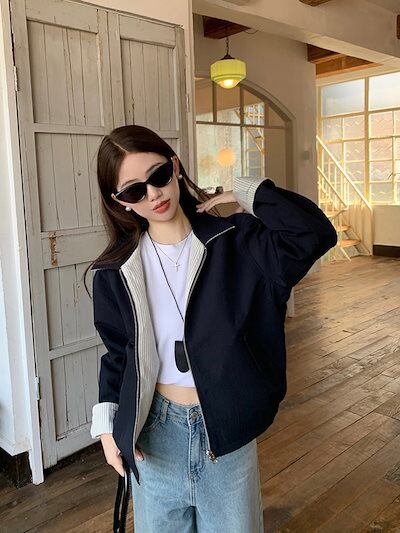 2024 秋冬アウター ジャケット ショートコート リバーシブル ストライプ 長袖 ジップ チャック 襟 秋 白 黒 おしゃれ かわいい 韓国ファッション レディース お出かけ