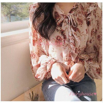 ブラウス レディース 長袖ブラウス 新作 オフィスブラウス 花柄リボンフレア オシャレブラウス シフォントップス 韓国風 大人 通勤ゆったりシャツ 40代