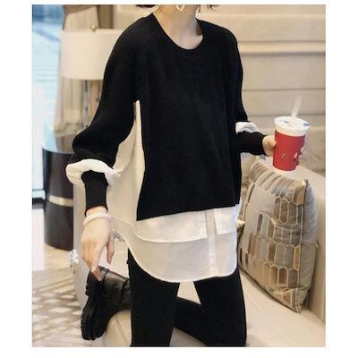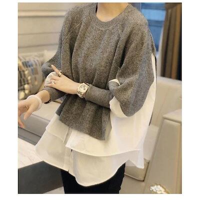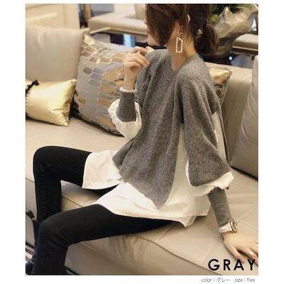 メガ割 ニットドッキングブラウス ニット ブラウス 異素材 レディース 長袖 重ね着風 レイヤード風 Uネック トップス シャツ チュニック ブラック ホワイト 新作 フリー lgww-at4