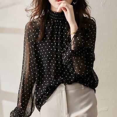 ブラウス 初春新作 上品 ブラウス レディース 韓国ファッション 水玉模様 長袖ブラウス 気質百掛け 長袖トップス 通勤 インナー 夏 セクシーレース袖 シフォンブラウス シャツ