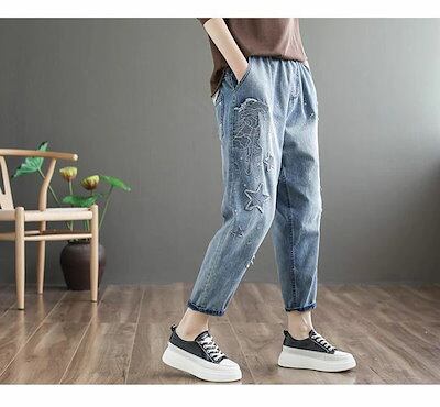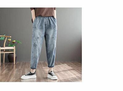 デニムパンツ レディース 大きいサイズ 春 夏 テーパードパンツ デニム ボトムス 星柄 チノパン ジーパン ロールアップ 森ガール 大人可愛い 春 無地 ズボン ウエストゴム 大きいサイズ 柔らかい