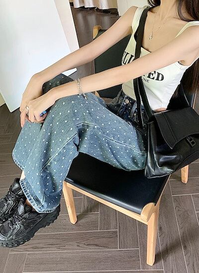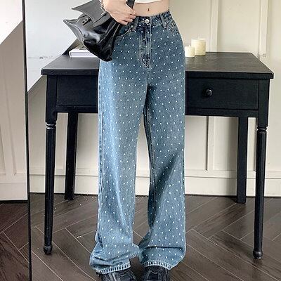 2024春夏パンツ デニム ジーンズ ドット柄 ワイド ストレート ハイウエスト 脚長効果 美脚効果 細見え 春 カジュアル おしゃれ かわいい 韓国ファッション レディース お出かけ