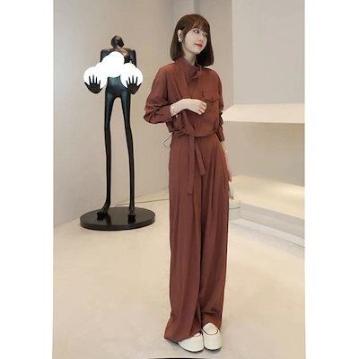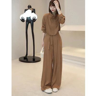 涼しく楽ちんセットアップ 2024新作気品スーツ長袖トップスにワイドパンツの2点セット レディース 韓国ファッション