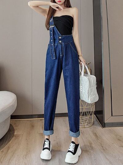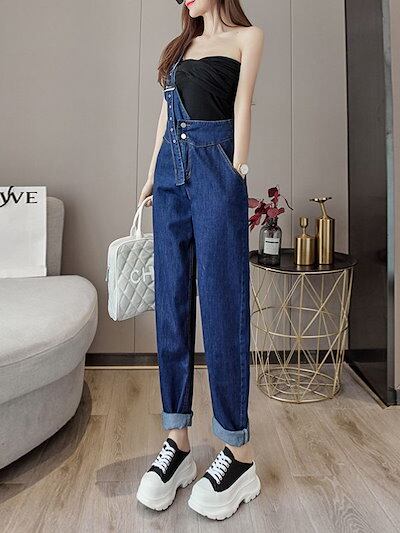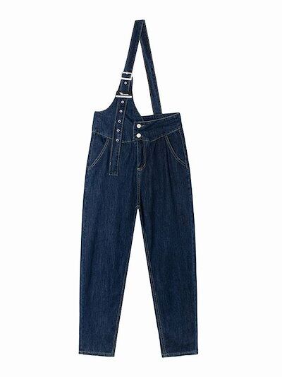 2025春夏 韓国 コーデ完成 ハイウエストスリムワンショルダーデニム サロペット オールインワン レディース ワイドパンツ サロペットパンツ