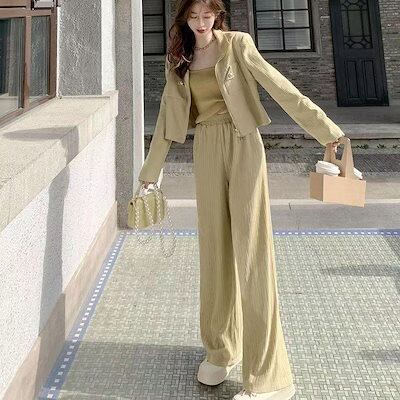 レディース 2点セット スポーツウェア 春秋 カジュアル ワイドパンツ ジョガーパンツ 長袖ブラウス 開襟 コート