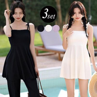 体型カバー水着 レディース 3点セット ママ水着 2WAY ワンピース水着 ペプラムトップス フレアパンツ センタースリット パッド付 黒 白 夏