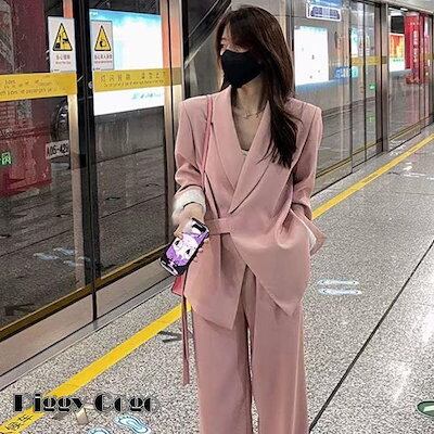 セットアップ レディース パンツスーツ 2点セット ジャケット ビジネススーツ ワイドパンツ ハイウエスト オフィス ストレートパンツ コーデ 長袖