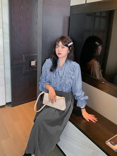【ぽちゃまに】 2024秋新品 フリルブラウス XL-5XL 大きいサイズ 可愛い リボン 体型カバー レディース ブラウス メガ割