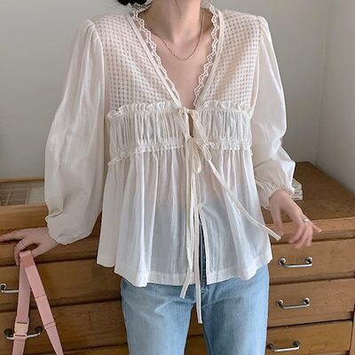 2024 秋冬トップス シャツ 長袖 Vネック 薄手 ゆったり リボン 秋 白 ホワイト おしゃれ かわいい ガーリー キュート 甘め 韓国ファッション レディース お出かけ
