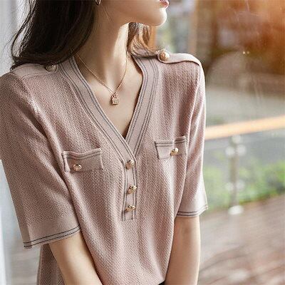 リボン Tシャツコレクション Vネック薄手半袖Tシャツ レディースアイスシルクジャージ通気性薄手トップス 今年もクルーネックトップスブラウス