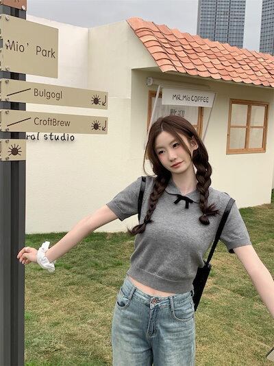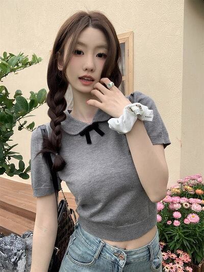 2024春夏トップス Tシャツ ニット 丈短め スリム 細見え 夏 かわいい おしゃれ 韓国ファッション レディース お出かけ