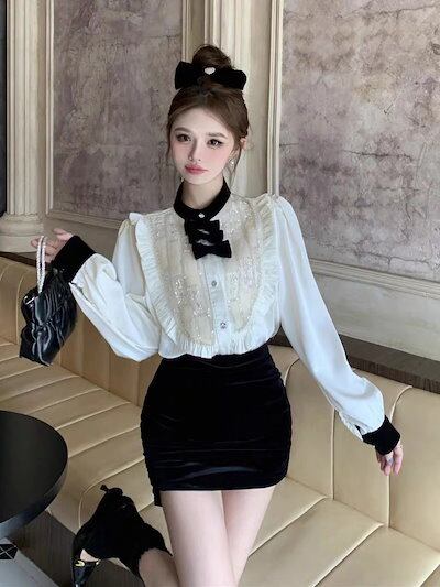 ブラウス プラクス2025新作韓国ファッションレディース お嬢様 ラインストーン付き リボン本 長袖ブラウス 通勤