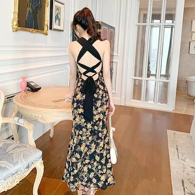 キャミワンピース レトロ スカート 2025夏 バックレス ネクタイ ロングスカート ブロークンフラワー サスペンダー フォーマル パーティー 着痩せ 同窓会 結婚式 披露宴 卒業式 演奏会