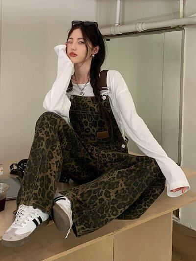 レトロヒョウ柄デニムサロペット春先ハイウエストストレートワークパンツゆったりワイドモップロングパンツ