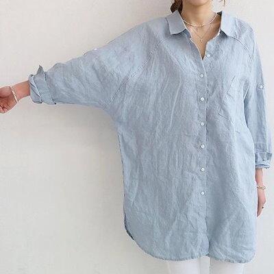Tシャツカットソー シフォンブラウス 夏 長袖シャツ トップス 韓国ファッション シャツ レディース シャツワンピース ブラウス 体型カバーチュニック 綿麻 ゆったり リネン素材 体型カバー ゆっ