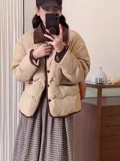 冬アウター コットンジャケット女性ショートデザインセンスストライプベルベットヒットカラーラペル緩いパン服新しい冬のカレッジスタイルのジャケット綿の服
