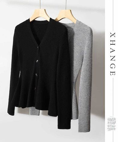人気なリブニット気質ラッフル裾 長袖ニットトップス 高級感 Vネックウエスト引き締め着やせ セーター レディース 日韓ファッション 百掛け肌触り柔らかなニット 通勤