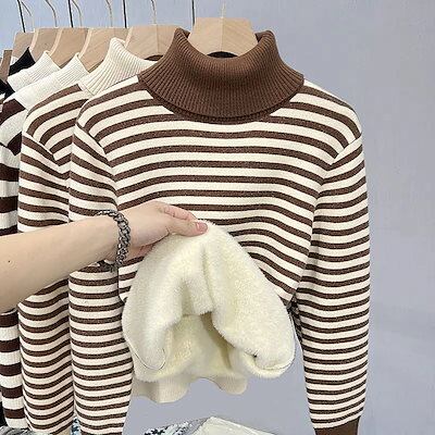 人気なリブニット 裏起毛ファッション カシミヤタッチ 裹起毛 ニットトップス 厚手 超保温ストライプセーター百掛けトップス インナー 裹起毛ベーシックニットハイネック秋冬タートルネック