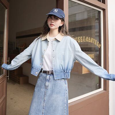 2025コーデに役立つ!デニムジャケット レディース 2025春の韓国ゆったりデニムショートジャケット女性のグラデーションストライプ 韓国ファッション