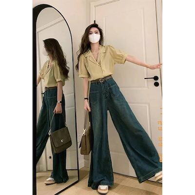 【3日以内出荷】スラックスパンツ デニムパンツ 大きいサイズ ジーンズ レディース 2024 新作 ハイウエスト スリム ゆったり デザイン モップ本 ワイドパンツ 韓国