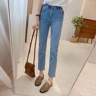 【3日以内出荷】脚長効果!スキニーデニムパンツ 2024新型 ミニストレートダウン感ハイウエストゆったりスリムシガレットパンツストレッチ レディース 韓国ファッション