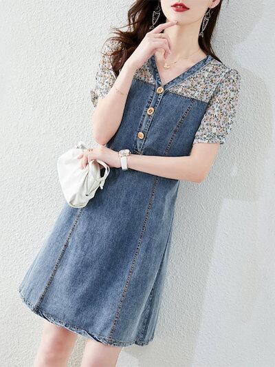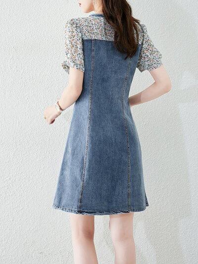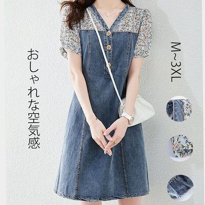 【2枚購入で 2oo円OFF!】 2025夏 新作 フレンチテイスト フェイクツーピース デニムワンピース デザイン重視 ユニーク切り替え 着痩せ 半袖 花柄 トレンディスカート