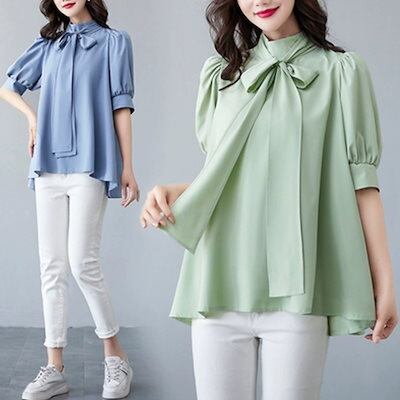 韓国 Tシャツ 夏開き襟トップス ゆったり着痩せ 大きいサイズレディース トレンド半袖 Tシャツトップス カジュアルおしゃれ 蝶結び 紐 シフォン材質 接触冷感 通勤