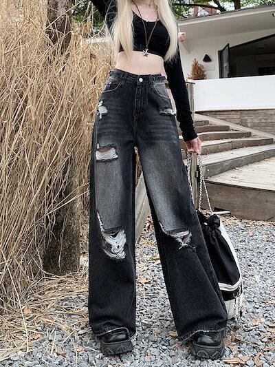 デニムパンツ ブラック 穴 ジーンズ レディース 春秋 ストレート ルーズ ワイドパンツ