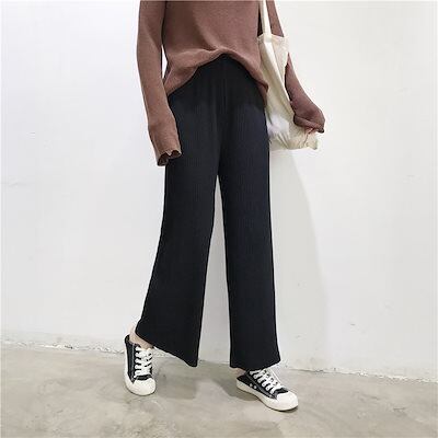 韓国ファッション ロングスラックスパンツ 着痩せロングパンツ 伸縮性のあるウエスト ストレート ガウチョパンツ スラックスパンツ