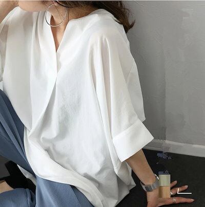 Tシャツカットソー 新作/夏/Vネック/プルオーバー/トップス/2025/ゆったり/薄手/無地/カジュアル/サンシャツライナー/女性/ワンピース ブラウス 福袋 T
