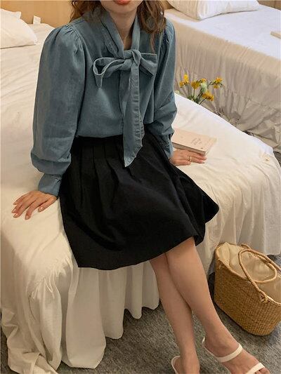 ボウタイブラウス デニム シャツ レディース チュニック 長袖 トップス 春 秋 無地 ボウタイ デニムトップス プルオーバー リボン デザインブラウス ゆったり カジュアル エレガント おしゃれ 着