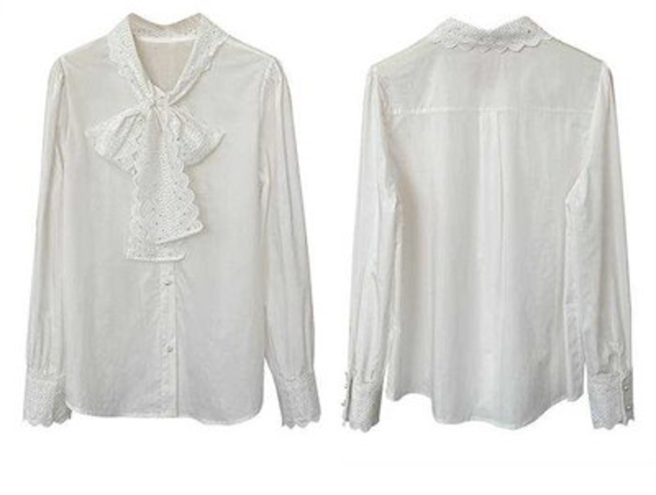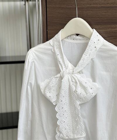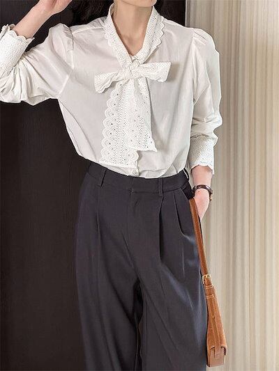 ブラウス レディース フォーマル 長袖 秋 春 コットン レース シャツブラウス シャツ ブラウス 女性らしい リボン オフィス 無地 ファション トップス きれいめ カジュアル 長袖シャツ 体型カバ