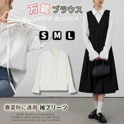 今月の販促!白ブラウス レディース 春 新作 袖プリーツ 襟リボン 万能 上品 大人可愛い トップス 高級感 無地 きれいめ ミディアム丈 ビジネス フォーマル デート キレイめ 着痩せ シンプル 定