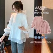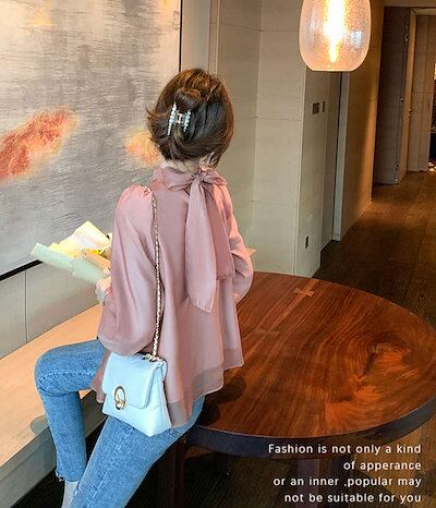春新作 ブラウス レディース ボウタイブラウス ボウタイ リボンブラウス ボリューム袖 袖ギャザー ふんわり袖 長袖 大人 無地 個性的 体型カバー 春夏新作 おしゃれ パフスリーブ シフォンブラウス