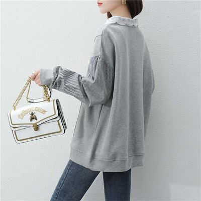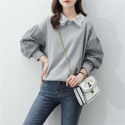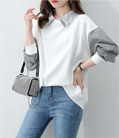 ブラウス 長袖 ニット ドッキングシャツ レディース 春 秋 トレーナー パーカー セーター 重ね着風 トップス プルオーバー ゆったり おしゃれ 白 黒 グレー リボン襟付き 学生 女性らしい 可