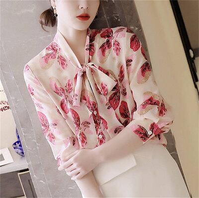 シフォン ブラウス フォーマル レディース 春 シャツブラウス シャツ ブラウス 長袖 女性らしい リボン オフィス 花柄 総柄 トップス きれいめ 秋 カジュアル 長袖シャツ 体型カバー 通勤 ゆっ