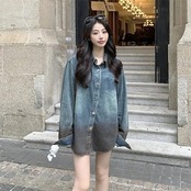 【1つ買うと1つ無料】24トップス シャツ デニム生地 グラデーション ボタン 襟 グレー 長袖 ゆったり 丈長め かわいい おしゃれ 韓国ファッション レディース お出かけ
