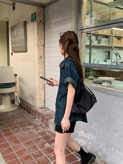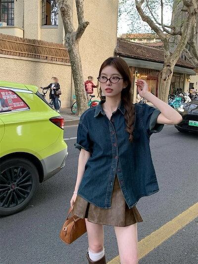 【1つ買うと1つ無料】24トップス デニムシャツ 半袖 ボタン 襟 スタンダードカラー ゆったり おしゃれ かわいい カジュアル 韓国ファッション レディース お出かけ