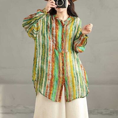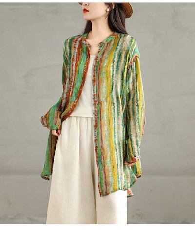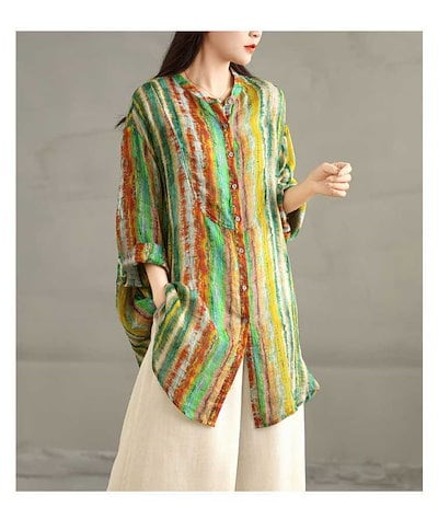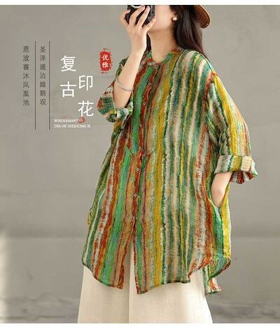 「ファットガール」 春 大きいサイズ ヴィンテージ リネン プリント ボタンシャツ 体型カバー レディース メガ割