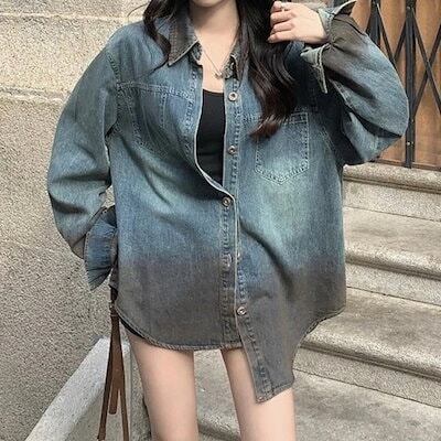 【裕福になる】24トップス シャツ デニム生地 グラデーション ボタン 襟 グレー 長袖 ゆったり 丈長め かわいい おしゃれ 韓国ファッション レディース お出かけ