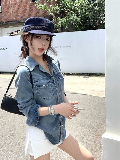2024秋冬トップス シャツ デニム生地 ポケット 襟 スタンダードカラー ボタン 長袖 秋 青 ブルー おしゃれ かわいい 韓国ファッション レディース お出かけ