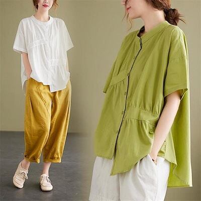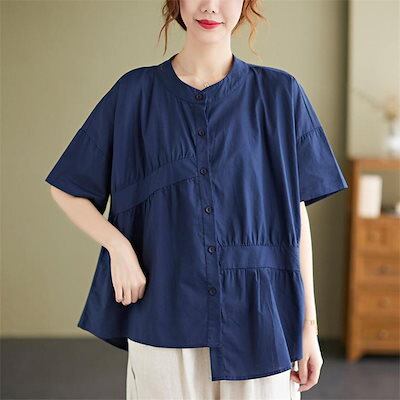 シャツ 半袖 ゆったり レディース 無地 綿 夏新作 不規則 前後差 前開き ボタン留め 自然に体型カバー 通気性いい シンプル 大きいサイズ