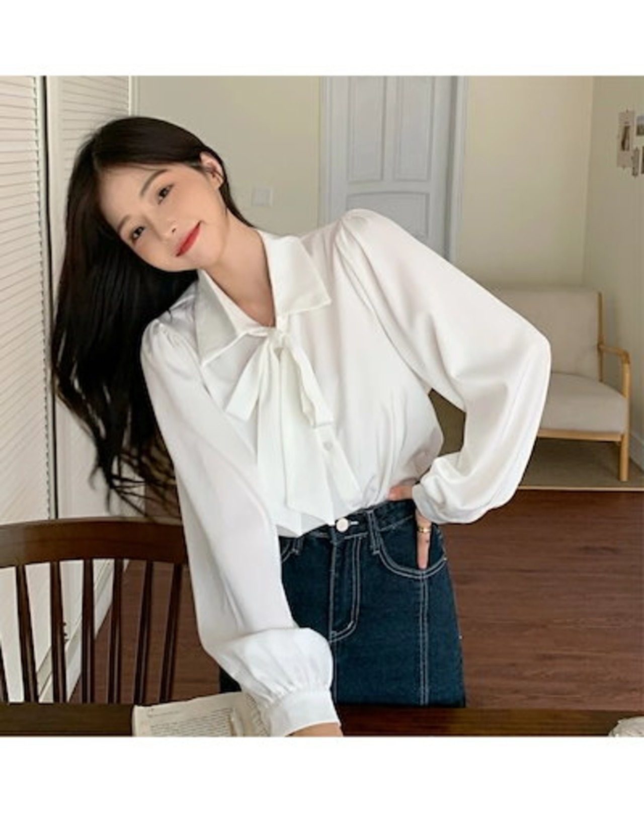ボウタイブラウス レディース リボン ボウタイ 長袖 長袖シャツ リボンブラウス 襟付き トップス シャツ Tシャツ 軽い 薄い 無地 折襟 バルーン袖 ぽわん袖 前開き 通気性 大きいサイズ 通勤