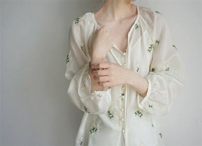 ブラウス シャツ 長袖 刺繍ブラウス レディース 長袖ブラウス vネック シャツブラウス バルーン袖 花柄シャツ 夏 花柄刺繍 涼しげ 薄手 ゆったり バルーンスリーブ リボン付き エレガント 長袖シ