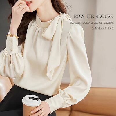 ボウタイ ブラウス きれいめ 長袖 レディース 春秋 キレイめ トップス シャツブラウス フォーマル オフィス リボン 結びリボン 結び襟 リボンタイ サテン ブラウス 着まわし ボウタイリボン シン