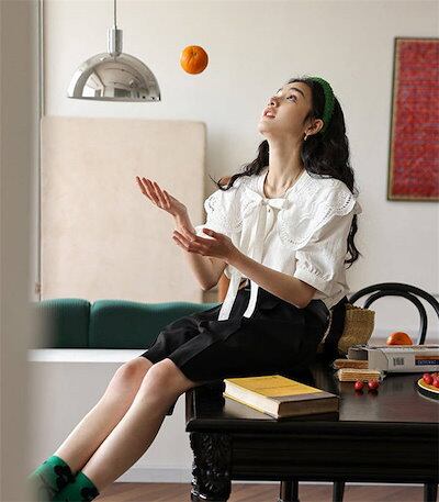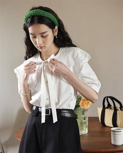 シャツ レディース 半袖 春 夏 秋 春夏秋 シャツブラウス レディースシャツ 無地 ビッグカラー リボン ギャザー パフ袖 パフ袖 可愛い カワイイ 若見え エレガント 配色 レイヤード 重ね着 カ