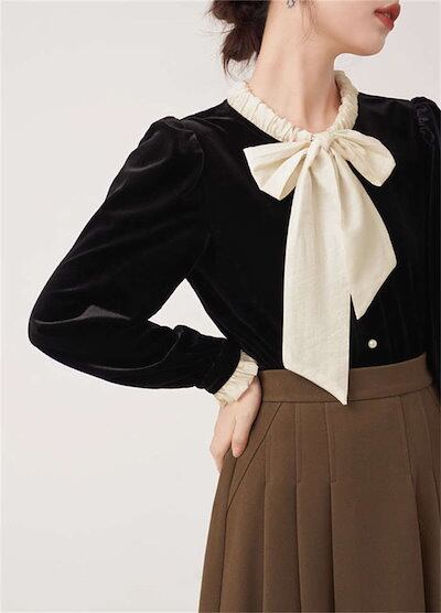 ボウタイブラウス 長袖ブラウス シャツ トップス 春 秋 冬 レディース おしゃれ かわいい ゆったり シンプル 無地 上品 ベロア 配色 ボウタイ リボン OL 通勤 オフィス カジュアル フェミニ
