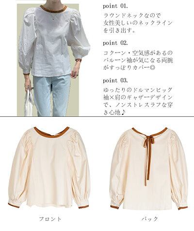 配色 ブラウス 白 長袖 プルオーバー シャツ レディース 春夏 ゆったり シャツブラウス バックリボン ラウンドネック ぽわん袖 長袖ブラウス ドルマン バルーン袖 ギャザー 前後差 スリット カッ
